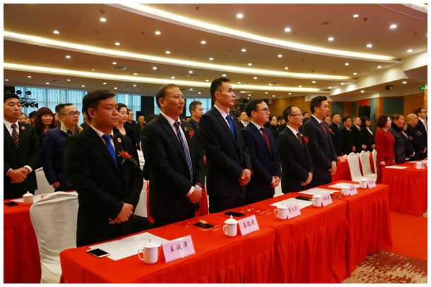 ▲全场起立 奏唱国歌