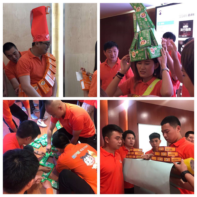 在营销将士们的巧手下,新产品肠炎宁颗粒的样盒被做成了长裙,无糖夏桑菊颗粒的样盒被做成了皇冠和宝剑,而小儿肺热的样盒则被做成飘带、阳伞和背包。当三组选手穿着产品样盒做成的时装上台走秀时,全场沸腾,培训会的气氛达到了高潮!所有在场的人员,都通过全员参与设计这场活泼生动的时装表演,对新品留下了深刻的印象。同时,OTC营销将士群策群力,在短时间内策划出这场活动,体现了九游会j9人超强的凝聚力、执行力及战斗力。