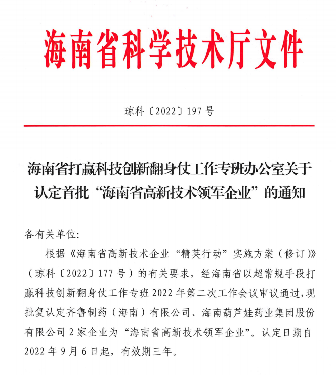 九游会企业·J9 - 中国官方网站 | 真人游戏第一品牌 集团聚焦“三新”中的现代生物医药产业,凭借在引领作用、产业带动、研发水平、创新能力等方面的优异表现,被成功认定为“海南省高新技术领军企业”,体现了海南省科技主管部门对公司的高度认可。