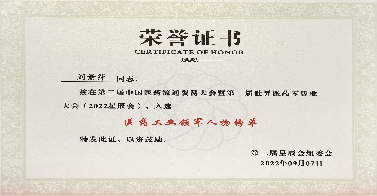 本次星辰会期间,九游会j9斩获颇丰,获得多项行业奖项及荣誉。在开幕式上,刘景萍董事长荣获“医药工业领军人物”称号。