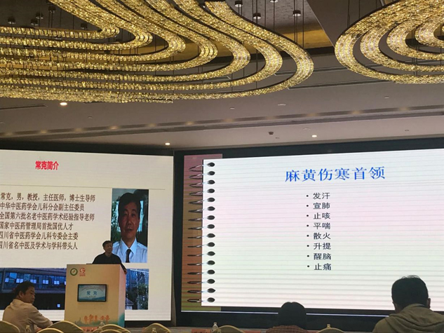 在21日下午的温病分论坛上,中华中医药学会儿科分会副主任委员、四川省中医药学会儿科专委会主委、四川省名中医及学术与学科带头人常克教授发表了《根植中华沃土,经方排名拙见》的精彩演讲。他指出,根据自己多年的儿科临床经验,在治疗小儿呼吸道感染的经方中,以麻黄为首的经方排头筹,尤其是小儿肺热咳喘颗粒的组方之一麻杏石甘汤在治疗呼吸道感染引起的发热、咳嗽、咯痰、气喘等方面疗效显著。