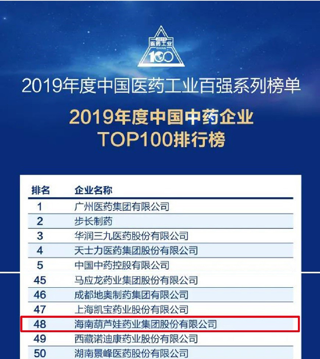 集团股份有限公司凭借扎实的研发生产实力和稳健的市场推广能力,成功入选“2019年度中国医药工业百强系列榜单”子榜单“2019年度中国中药企业TOP100排行榜”,在短短一年时间内,从2018年度的中国中药企业第63名跃升至第48名。